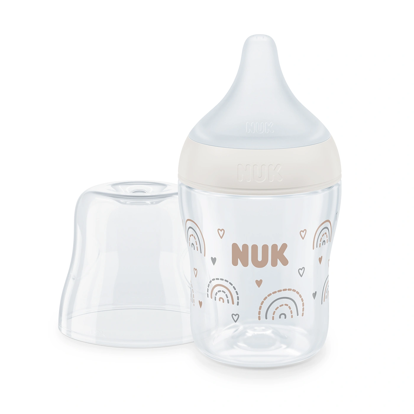 Biberon NUK Perfect Match, con tettarella in morbido silicone taglia S, 120 ml, da mesi, in vetro, anti-coliche, con controllo della temperatura nella variante Rainbow.