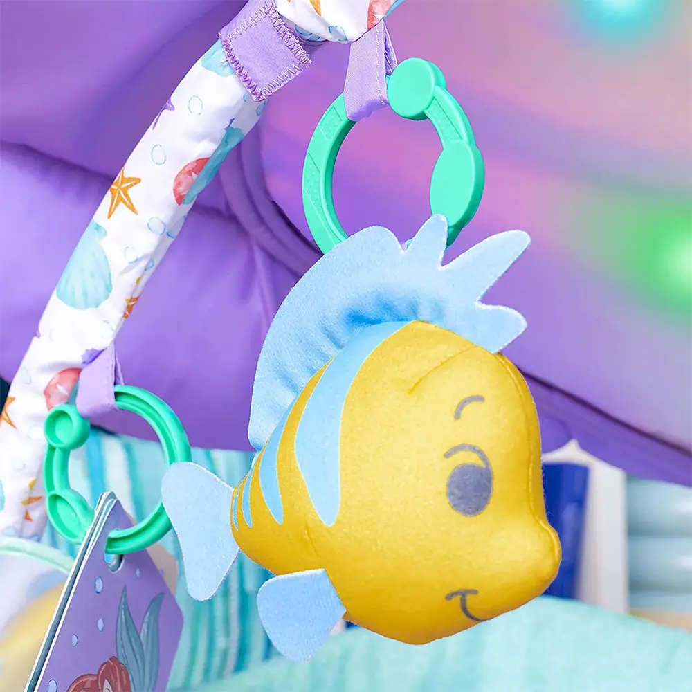 Il tappetino include 6 giocattoli removibili a tema La Sirenetta, tra cui Sebastian, Flounder, un cavalluccio marino, uno specchio per il tummy time, un sonaglio e un gioco testurizzato a forma di dollaro di sabbia. Tutti i giocattoli si possono anche utilizzare separatamente, rendendoli ideali per l’intrattenimento anche fuori casa.