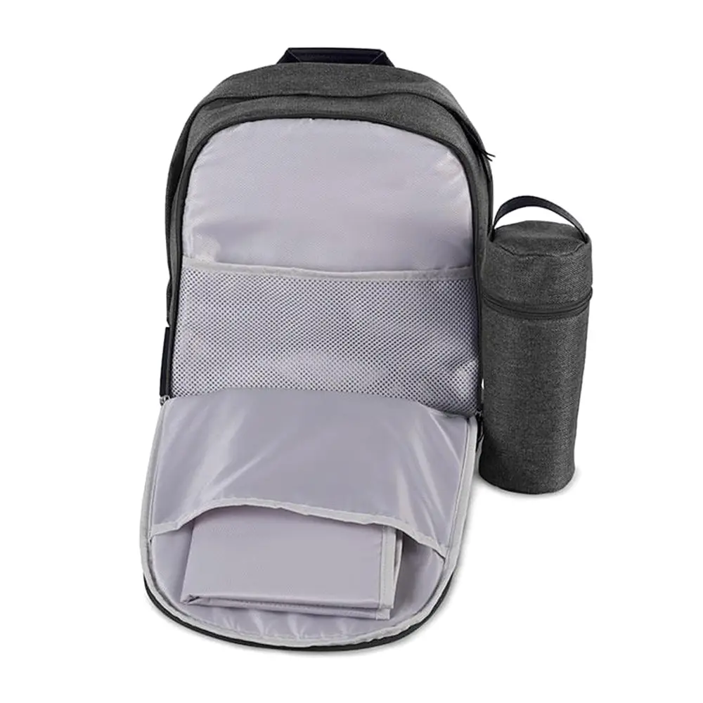 Questo zaino versatile può essere trasportato a spalla o agganciato al passeggino grazie ai pratici ganci integrati. All’interno offre scomparti multipli per tenere tutto in ordine, un fasciatoio portatile facile da pulire, una custodia termica per biberon, oltre a un ampio spazio per oggetti personali o persino un laptop.