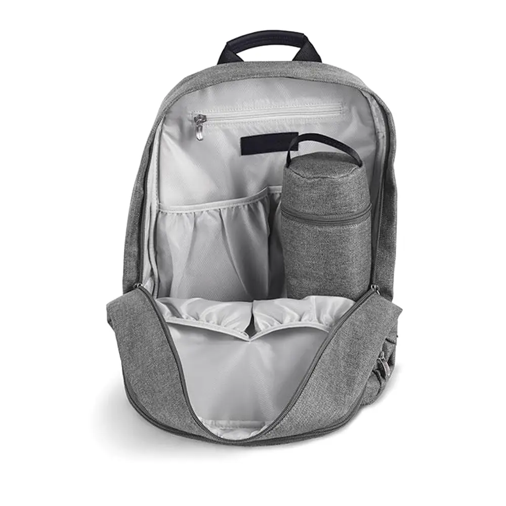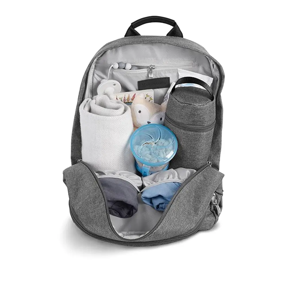 Questo zaino versatile può essere trasportato a spalla o agganciato al passeggino grazie ai pratici ganci integrati. All’interno offre scomparti multipli per tenere tutto in ordine, un fasciatoio portatile facile da pulire, una custodia termica per biberon, oltre a un ampio spazio per oggetti personali o persino un laptop.